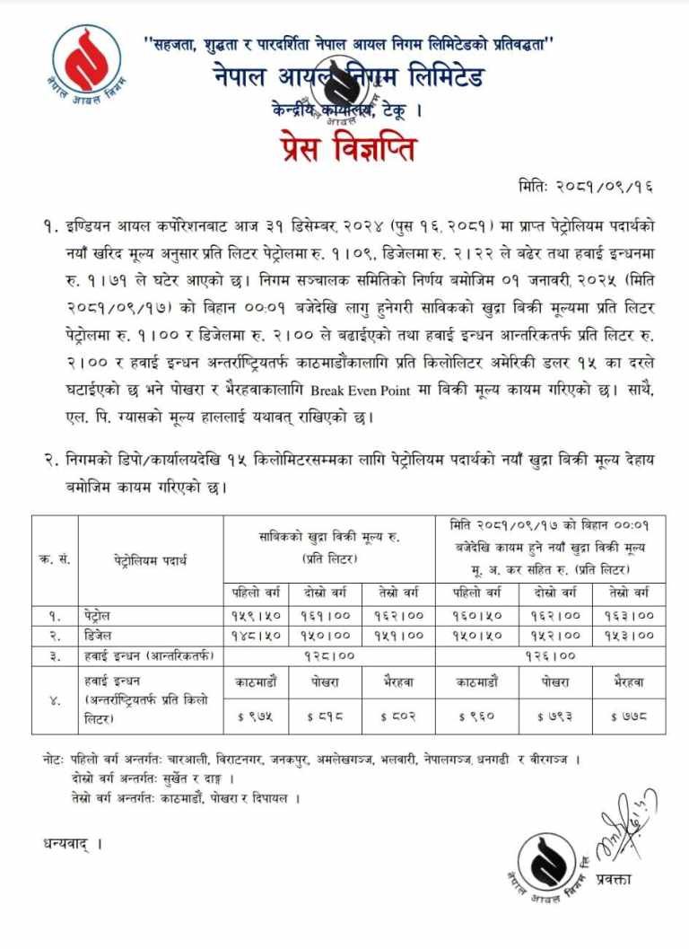 आज मध्यरातिदेखि लागु हुने गरी मूल्य बढाइएको छ । पेट्रोलको मूल्य प्रतिलिटर एक रुपैयाँले बढाइएको निगमले जनाएको छ । निगमले हवाई इन्धनको मूल्य भने घटाएको छ । हवाई इन्धन आन्तरिकतर्फ प्रतिलिटर दुई रुपैयाँ र अन्तर्राष्ट्रियतर्फ काठमाडौंका लागि प्रतिकिलोलिटर अमेरिकी डलर १५ का दरले घटाइएको निगमले जनाएको छ ।