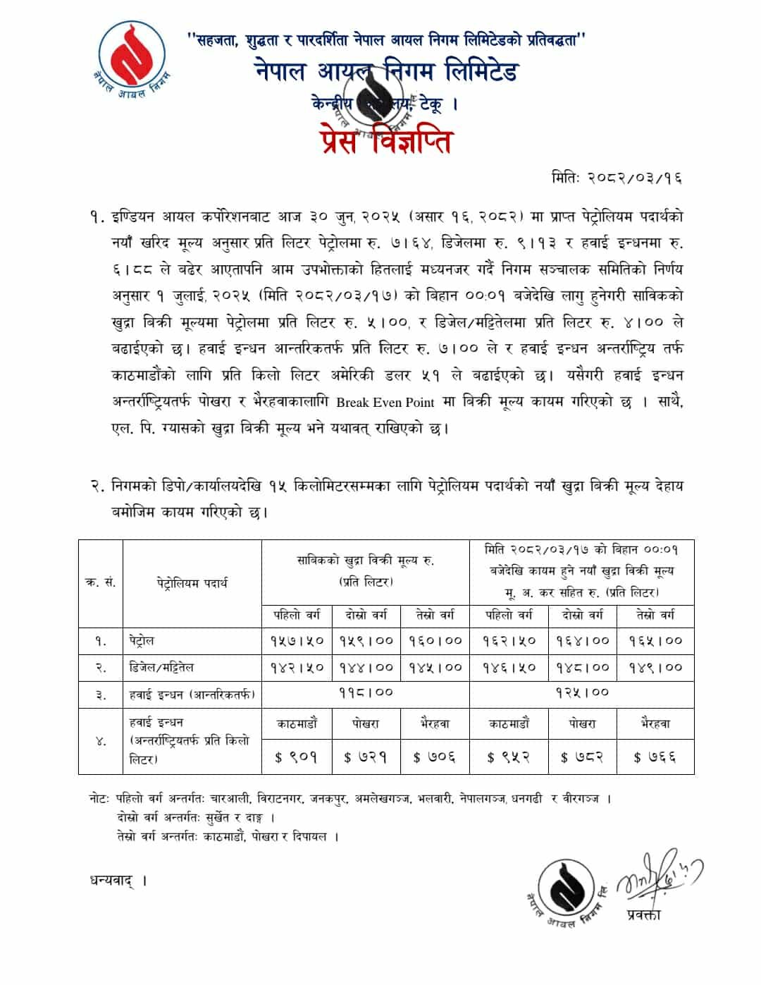 मंगलबार(आज)बाट लागू हुने गरी पेट्रोलमा ५ रुपैयाँ र डिजेल तथा मट्टितेलमा ४ रुपैयाँ मूल्य बढाइएको निगमले जारी गरेको विज्ञप्तिमा उल्लेख छ । त्यस्तै आन्तरिक हवाई इन्धनमा ७ रुपैयाँ र अन्तर्राष्ट्रिय हवाई इन्धनमा प्रति किलोलिटर ६० डलर मूल्य बढेको छ । पेट्रोलियम पदार्थका उत्पादन र वितरण गर्दै आएका मध्यपूर्वी देशहरुमा चलेको द्वन्द्धका कारण विश्व बजारमा पेट्रोलियम पदार्थको मूल्यमा भारी बृद्धी आएको छ ।