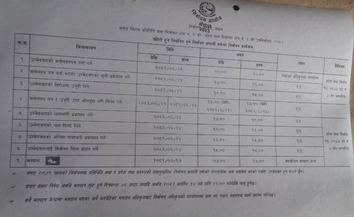 मनाङ जिल्ला प्रदेशसभा–२ को उपनिर्वाचनका लागि मनोनयन दर्ता असोज २१ गते ।