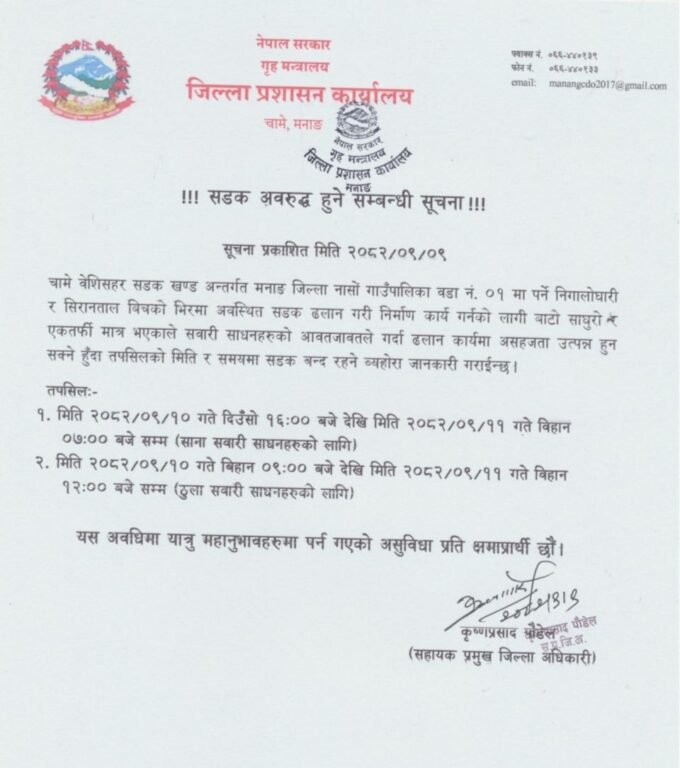 सडक अवरुद्ध हुदाँ सर्वसधारण तथा यात्रु मानुभवहरुमा पर्न जाने असुविधाप्रति जिल्ला प्रशासन कार्यालय मनाङले क्षमा याचना समेत गरेको ।