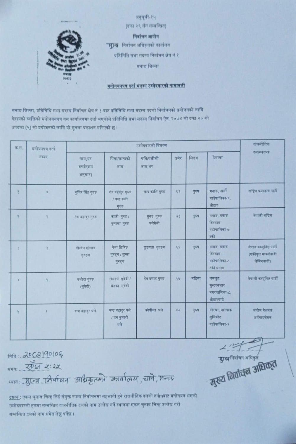 निर्वाचन आयोगले निर्धारण गरेको कार्यतालिका अनुसार आज बिहान १० बजेदेखि साँझ ५ बजेसम्ममा नेपाली काँग्रेसका टेकबहादुर गुरुङ, नेकपा (एमाले)का पोल्देन छोपाङ गुरुङ, नेपाली कम्यूनिष्ट पार्टीका यशोदा गुरुङ (सुवेदी) राप्रपाका कुबिरसिंह गुरुङ र मंगोल नेशनल अर्गनाइजेशनका रामबहादुर घलेले आसन्न प्रतिनिधिसभा सदस्य चयनका लागि मनोनयन पत्र दर्ता गराएको जिल्ला निर्वाचन कार्यालय मनाङले जनाएको छ ।