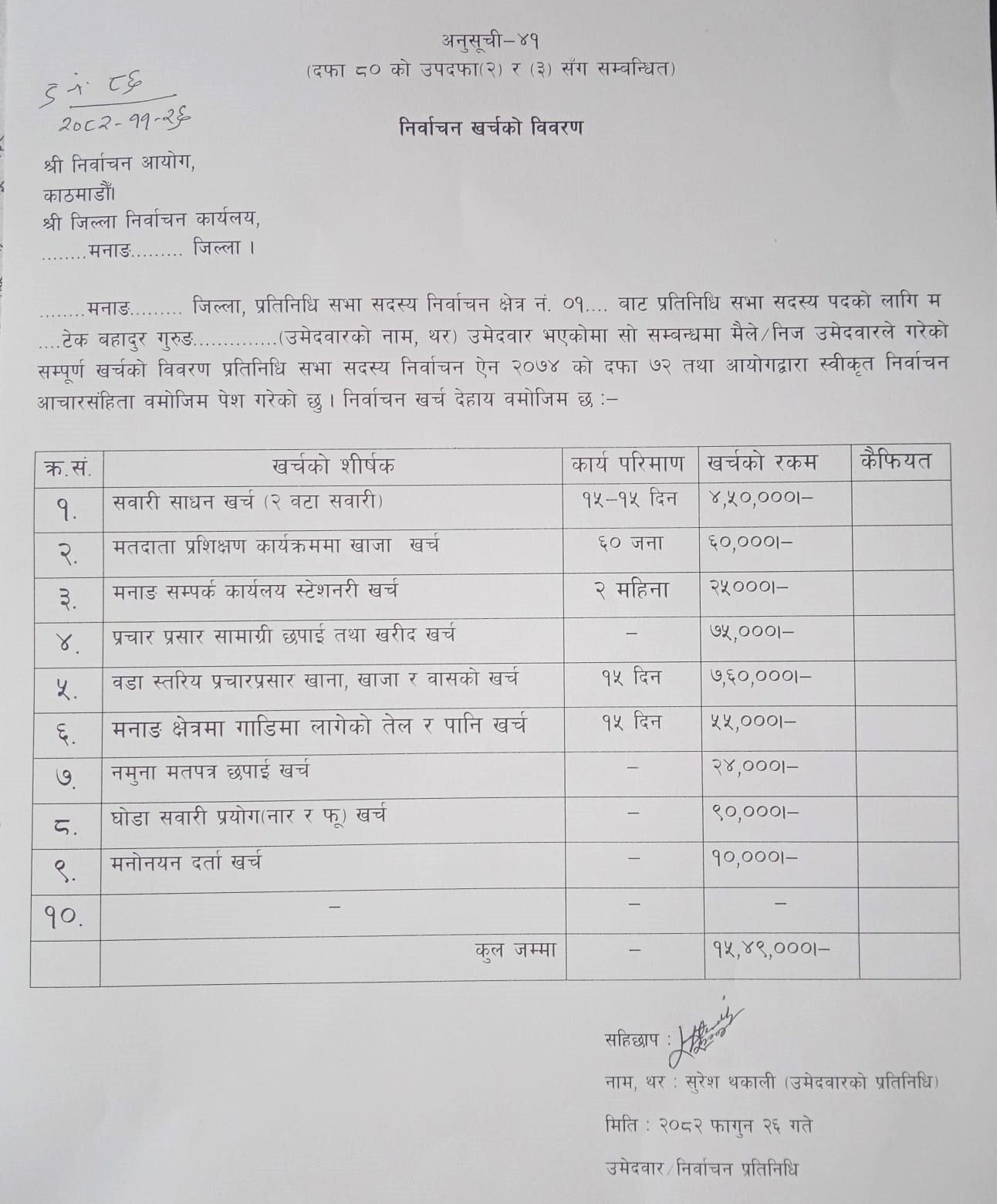 पेस गरिएको विवरण अनुसार मनोनयन दर्तामा १० हजार रुपैयाँ खर्च भएको छ । प्रचार–प्रसार सामग्रीछपाई तथा खरिदमा ७५ हजार रुपैयाँ, मतदाता प्रशिक्षण (६० जनाका लागि) ६० हजार रुपैयाँ खर्च गरिएको उल्लेख छ ।