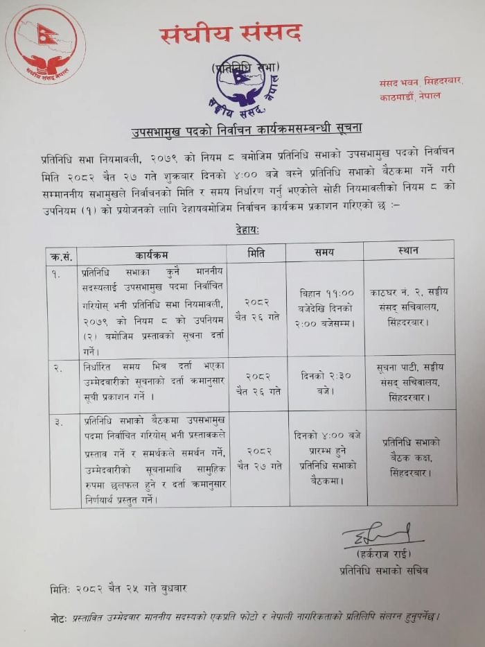 २७ गते उपसभामुखको निर्वाचन हुँदै छ । अपराह्न ४ बजे बस्ने प्रतिनिधिसभा बैठकमा प्रस्तावकले उपसभामुख निर्वाचित गरियोस् भन्ने प्रस्ताव पेस हुनेछ । त्यसमाथि छलफल भएर निर्णय गरिनेछ ।