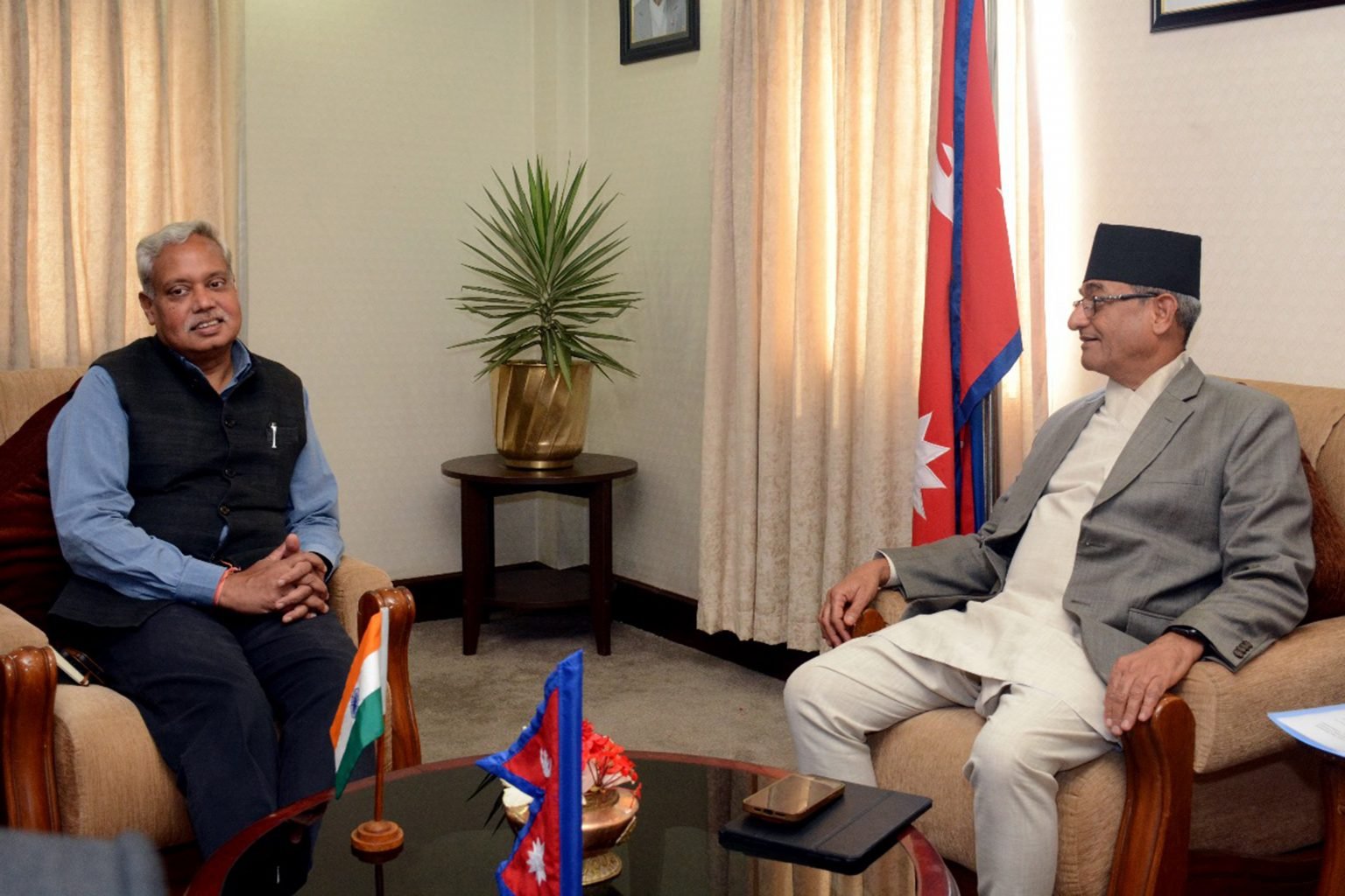 गृहमन्त्री लेखकसँग भारतीय राजदूत श्रीवास्वको शिष्टाचार भेट ।